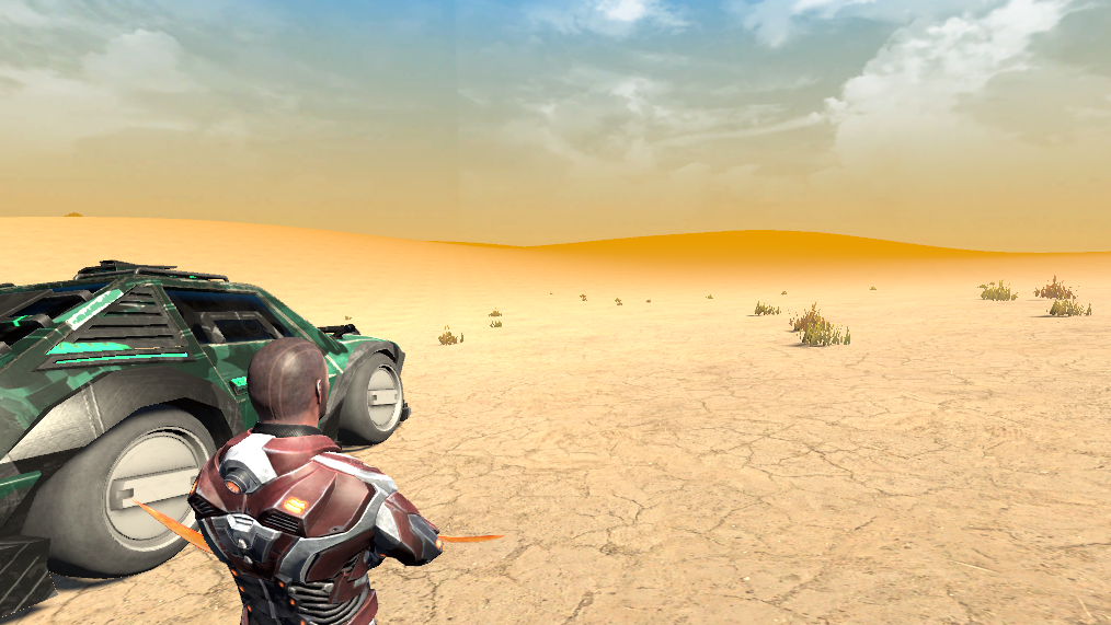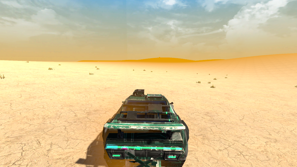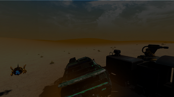 • Cinematic desert junkyard setting in a shattered timeline